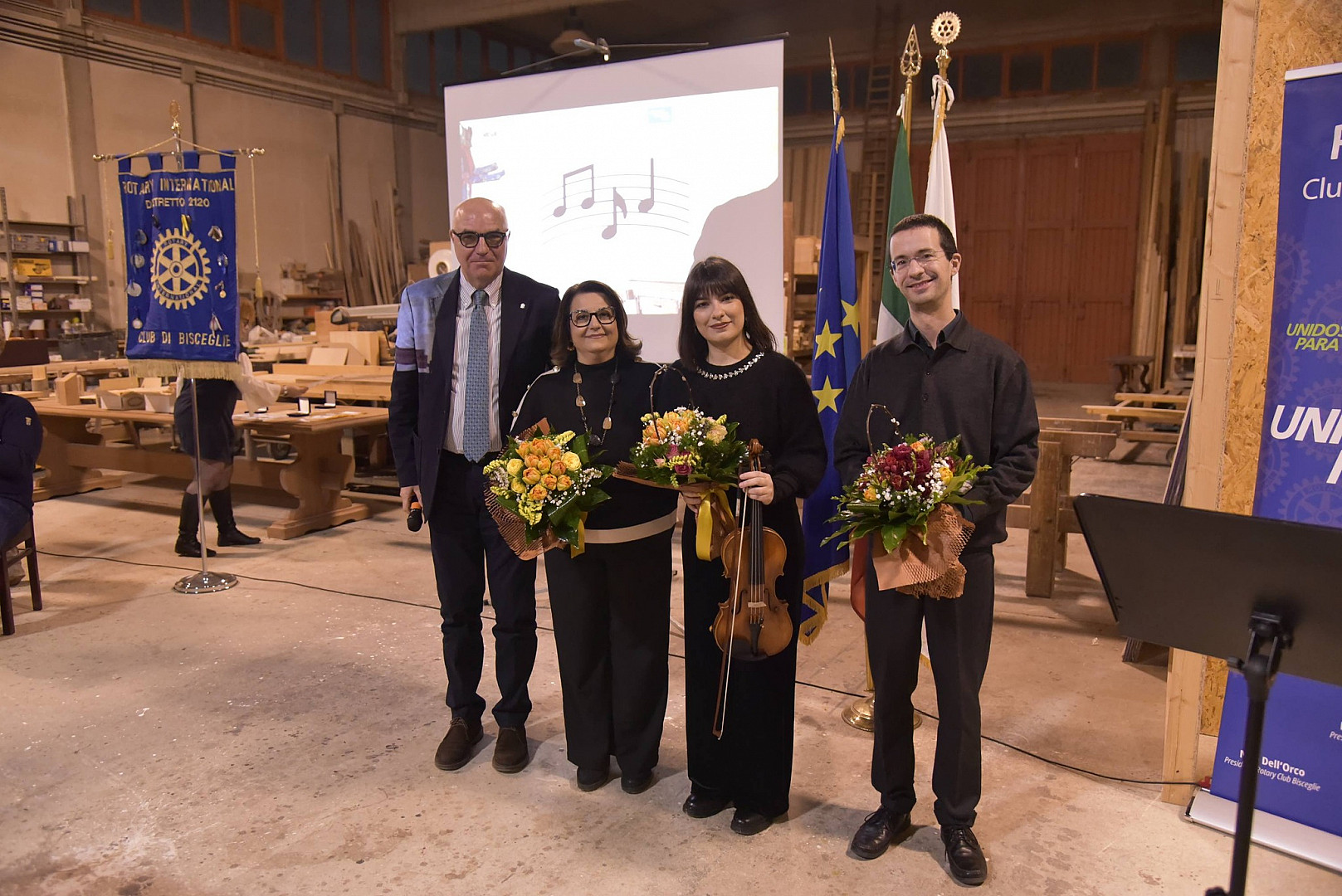 Promosso dal Rotary Club di Bisceglie, sotto la guida del presidente Nico Dell’Orco, l’incontro ha dato forma a una rara fusione di linguaggi, dimostrando come la divulgazione culturale possa farsi spazio vivo di ascolto, relazione e trasformazione. Qui il sapere non è stato esposto, ma condiviso; non dichiarato, ma incarnato. Il legno, materia antica e carica di simboli, è divenuto il fulcro narrativo dell’esperienza. Attraverso il dialogo tra don Matteo Losapio, filosofo, e Mauro Simone, esperto e cultore dell’arte dell’intaglio, il pubblico è stato condotto in un percorso in cui il pensiero si è fatto gesto e il gesto si è fatto parola. Il legno, scolpito e interrogato, ha raccontato il sacro, il tempo, la pazienza del fare umano; ha restituito l’immagine di una materia che resiste, accoglie, custodisce memoria e significato. A tessere con equilibrio il filo dell’incontro, la conduzione attenta e sensibile di Mauro Pedone, socio del Club, capace di mantenere in dialogo i diversi piani dell’esperienza senza mai spezzarne l’armonia. In questo paesaggio di senso, la musica non ha fatto da cornice, ma da sostanza. Gli intermezzi musicali, la voce e il flauto di Marzia Pedone, il violino di Sara Simone e il pianoforte di Emanuele Petruzzella; hanno aperto spazi di risonanza emotiva, dando profondità al silenzio e corpo al pensiero. La musica si è fatta linguaggio invisibile, capace di legare parola e materia, intuizione e ascolto.